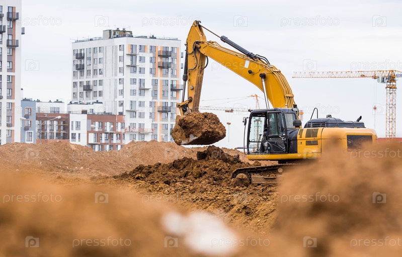 Экскаватор на строительной площадке крупным планом. Экскаватор выкапывает землю ведром для строительства. Тяжелая техника для строительства и озеленения