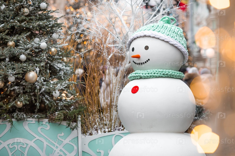 Красивый рождественский фон со снеговиком. Концепция подготовки и декорирования к новому году. Новогодняя открытка 2026. Праздничные игрушки и снеговики на улицах Москвы