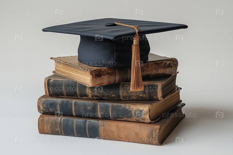 Выпускной колпачок на стопке старых книг, изолированных на сером фоне
