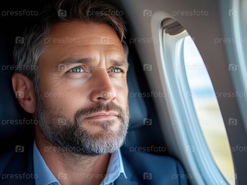 Портрет мужчины на пассажирском сиденье самолета