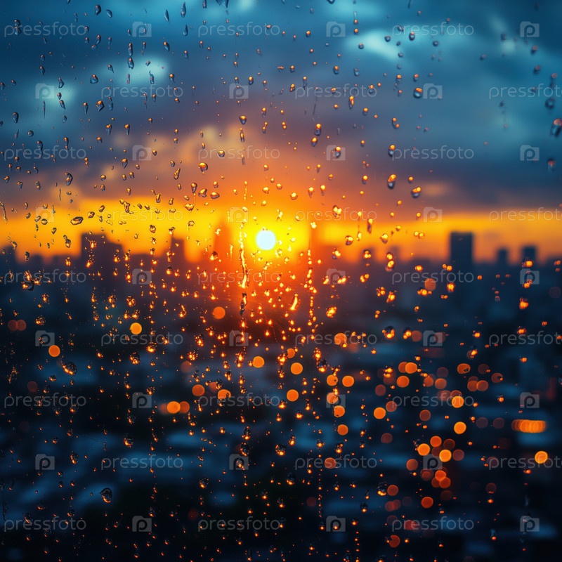 Фон: капли дождя на стекле, размытый город рассвета за стеклом