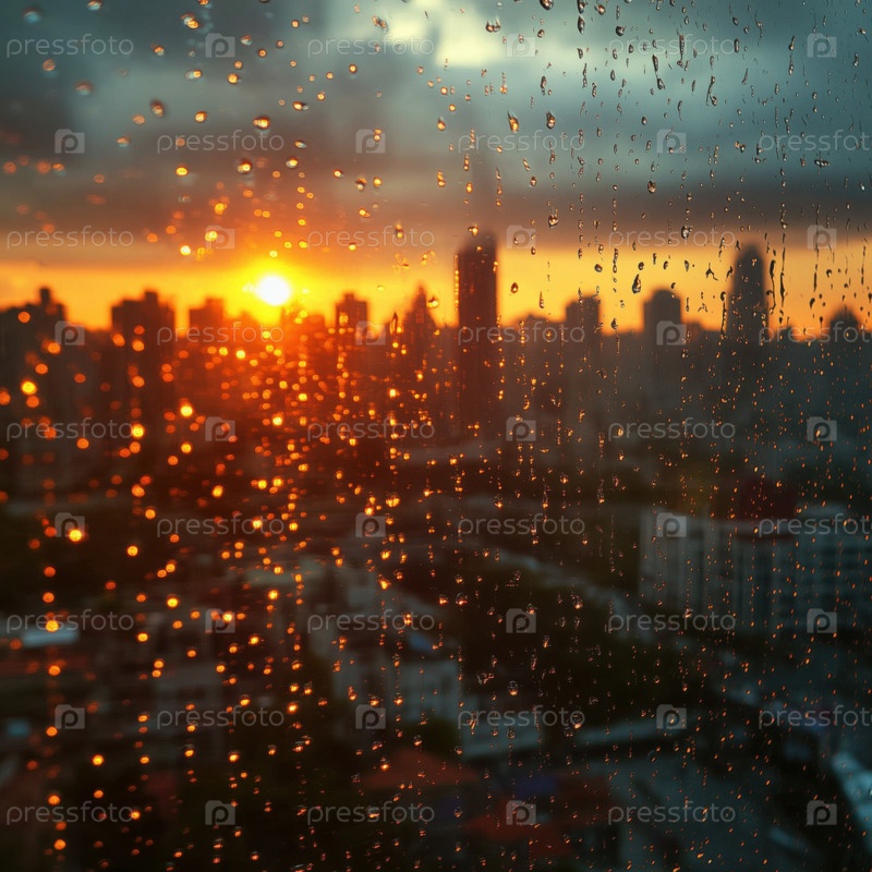 Фон: капли дождя на стекле, размытый закат городского пейзажа за стеклом