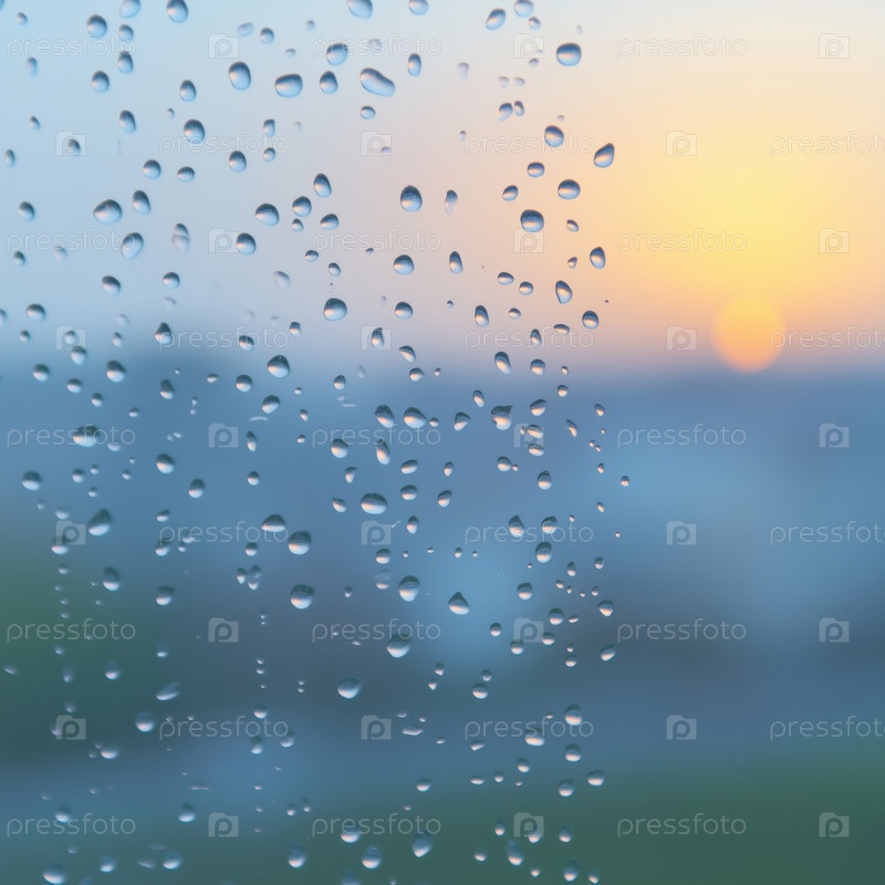 Фон: капли дождя на стекле, размытый пейзаж рассвета за стеклом