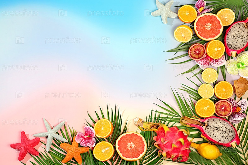 Лето в кадре. Драконий фрукт, питайя, апельсины, лимоны, абрикосы, цветы орхидей, ракушки на пальмовых листьях, тропический фон с экзотическими фруктами, красивый шаблон для вашего дизайна,