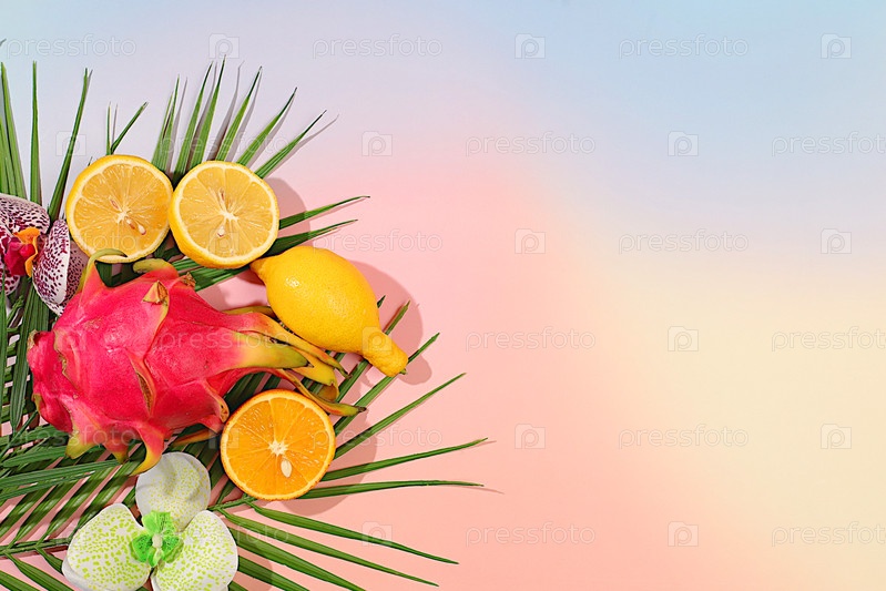 Плоды дракона, питайя, апельсины, лимоны, цветы орхидей на пальмовых листьях, тропический фон с пальмами и экзотическими фруктами, красивый шаблон для вашего дизайна, яркий баннер, лето в снимке