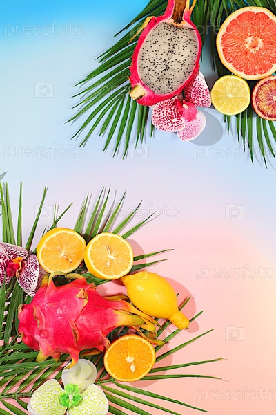 Тропический фон с пальмами и экзотическими фруктами, красивый шаблон для вашего дизайна с пространством для текста, яркий солнечный флаер, драконий фрукт, питайя, апельсины, лимоны, цветы орхидей на пальмовых листьях