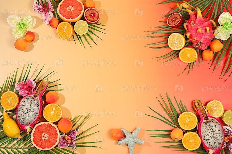 Лето в снимке, фрукты дракона, питайя, апельсины, лимоны, априкосы, цветы орхидей, грейпфруты на пальмовых листьях, Тропический фон с экзотическими фруктами, шаблон для вашего дизайна, солнечный баннер