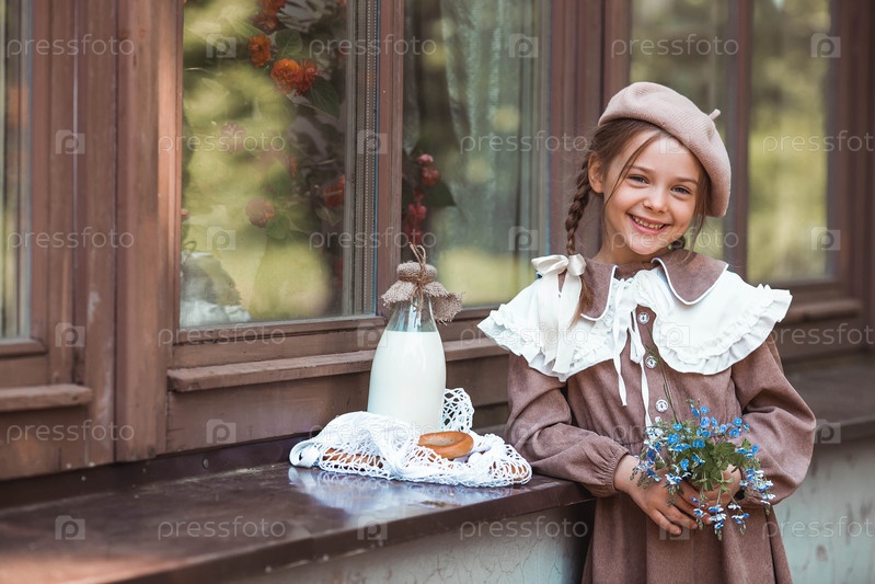 Винтажные аксессуары и одежда в стиле ретро. Маленькая, красивая девушка с луками в волосах, в бежевом платье и беретом на открытом воздухе с бубликами и молоком в струнной сумке