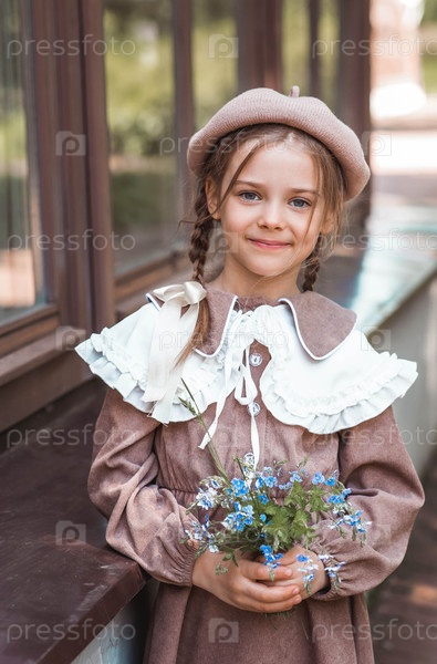 Винтажные женские аксессуары и одежда в стиле ретро. Маленькая, красивая девушка с луками в волосах, в бежевом платье и беретом на открытом воздухе