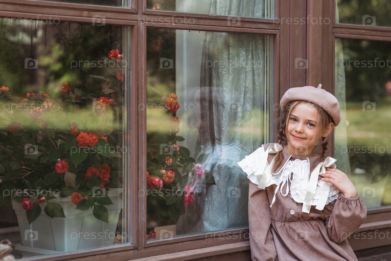 Винтажные женские аксессуары и одежда в стиле ретро. Маленькая, красивая девушка с луками в волосах, в бежевом платье и беретом на открытом воздухе