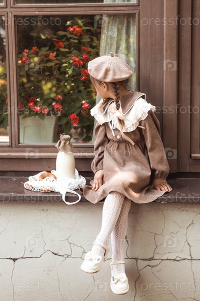Винтажные аксессуары и одежда в стиле ретро. Маленькая, красивая девушка с луками в волосах, в бежевом платье и беретом на открытом воздухе с бубликами и молоком в струнной сумке