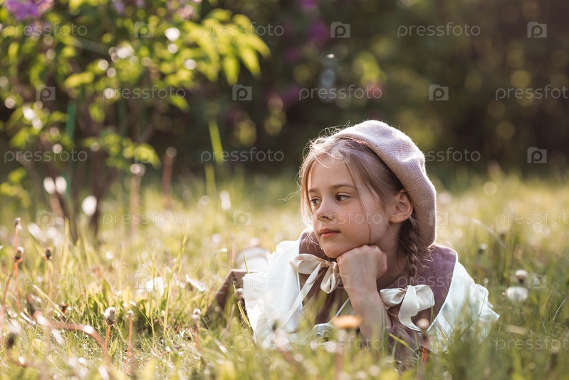 Винтажные женские аксессуары и одежда в стиле ретро. Маленькая, красивая девушка с луками в волосах, в бежевом платье и беретом на открытом воздухе