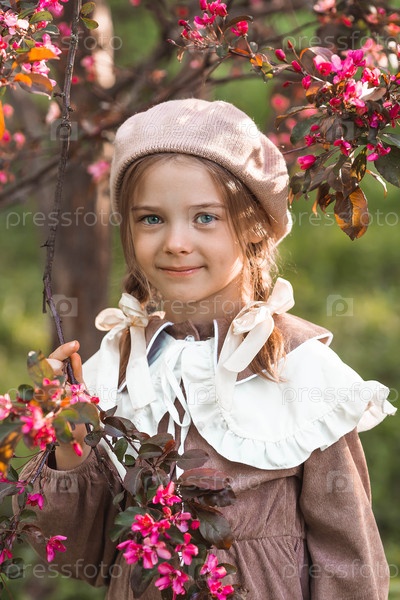 Винтажные женские аксессуары и одежда в стиле ретро. Маленькая, красивая девушка с луками в волосах, в бежевом платье и беретом на открытом воздухе