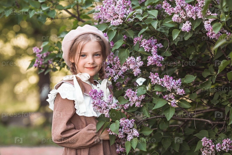 Винтажные женские аксессуары и одежда в стиле ретро. Маленькая, красивая девушка с луками в волосах, в бежевом платье и беретом на открытом воздухе