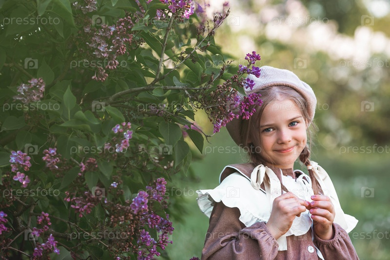 Винтажные женские аксессуары и одежда в стиле ретро. Маленькая, красивая девушка с луками в волосах, в бежевом платье и беретом на открытом воздухе