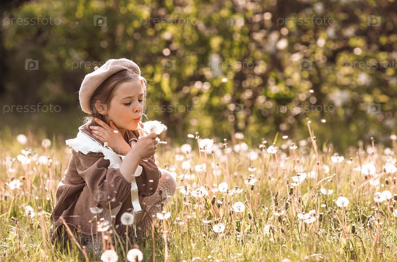 Винтажные женские аксессуары и одежда в стиле ретро. Маленькая, красивая девушка с луками в волосах, в бежевом платье и беретом на открытом воздухе