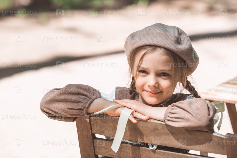 Винтажные женские аксессуары и одежда в стиле ретро. Маленькая, красивая девушка с луками в волосах, в бежевом платье и беретом на открытом воздухе