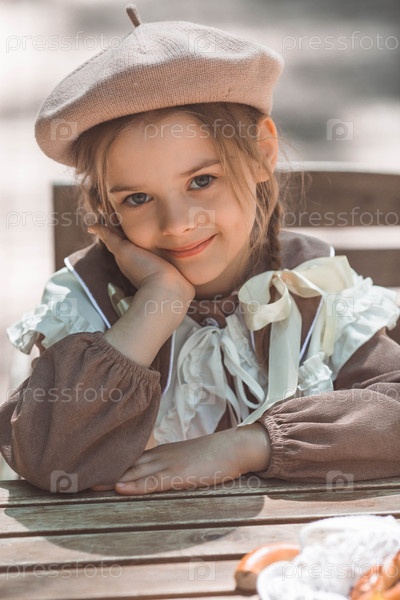 Винтажные женские аксессуары и одежда в стиле ретро. Маленькая, красивая девушка с луками в волосах, в бежевом платье и беретом на открытом воздухе