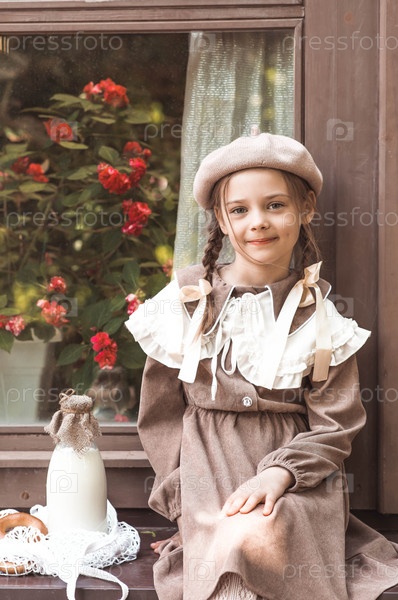 Винтажные аксессуары и одежда в стиле ретро. Маленькая, красивая девушка с луками в волосах, в бежевом платье и беретом на открытом воздухе с бубликами и молоком в струнной сумке
