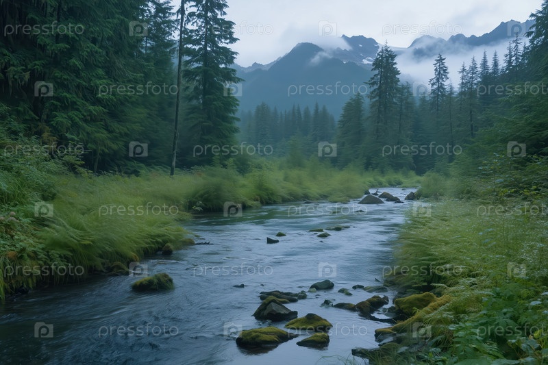 Быстрая скалистая река с чистой водой в лесистой горной долине