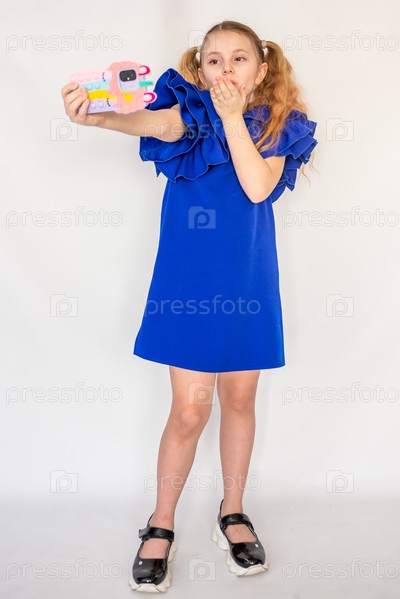 Портрет. Красивая нарядная девочка в синем платье держит в руках телефон. Ребенок - модель