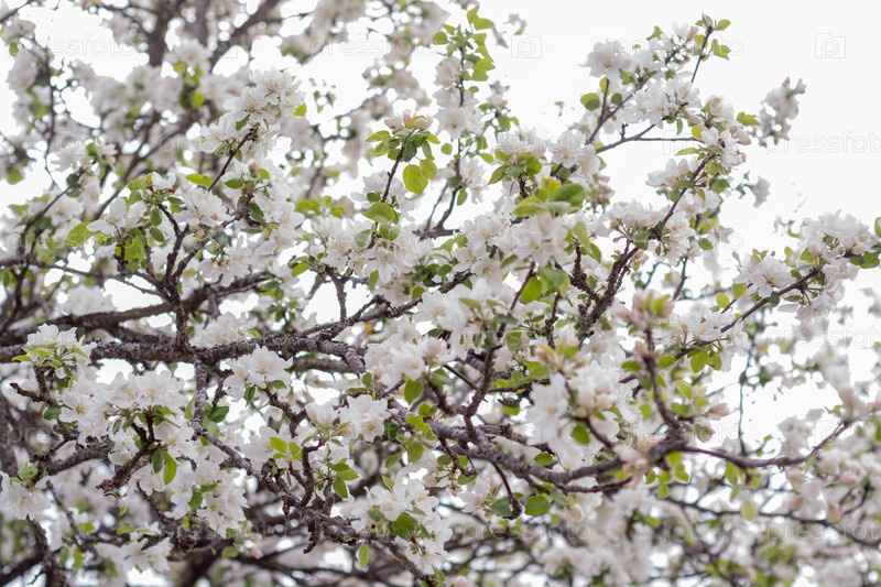 Весной в саду с белыми пышными цветами расцвела яблоня. Цветение яблони. Сад, В весеннее время в саду цветут яблоневые деревья с белыми буйными цветами. Яблочный цвет
