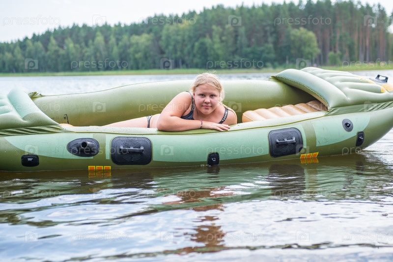Россия, Тверская область, Осташков, озеро Селигер. Красивая девушка в купальнике сидит в надувной лодке