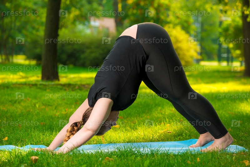 Плюс-размерная женская модель делает разминку в летнем парке ранним утром