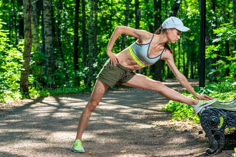 Спортивная девушка согревает мышцы перед пробежкой в парке