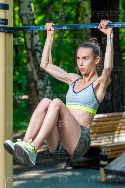 Спортивная женщина на детской площадке делает упражнения для прессы