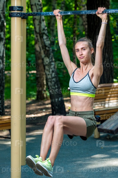 Красивая стройная женщина со спортивной фигурой на спортивном поле, выполняющая упражнения для прессы