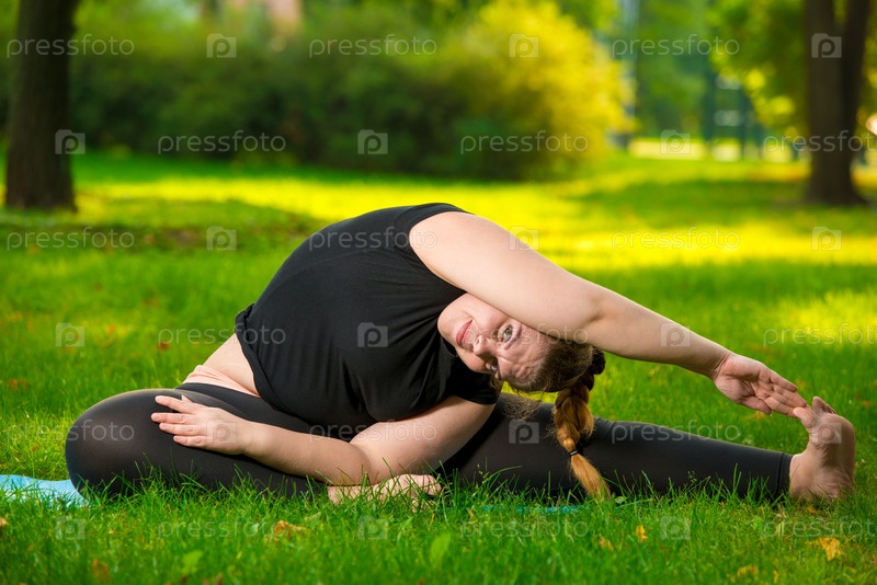 Гибкая женщина, занимающаяся йогой в парке на газоне