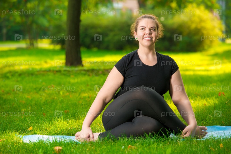 Веселая толстая женщина занимается йогой на открытом воздухе в парке