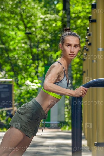 Стрельба спортсменки с мускулистой фигурой на спортивном поле