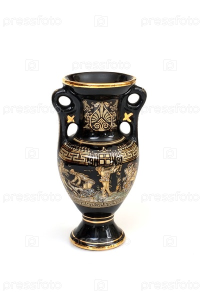 Сувенир из Греции в виде вазы выделен на белом фоне с мифологической фигурой
