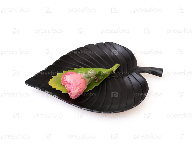 Состав с розовым цветком на черном блюде изолирован на белом фоне