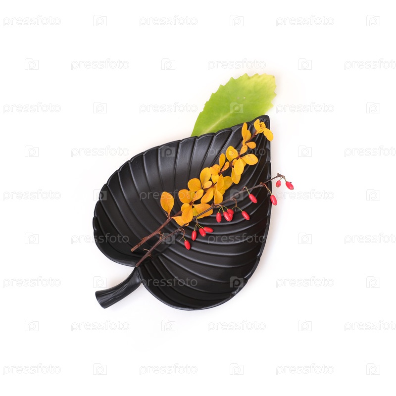 Состав с веткой и плодами барбариса на черном блюде изолирован на белом фоне