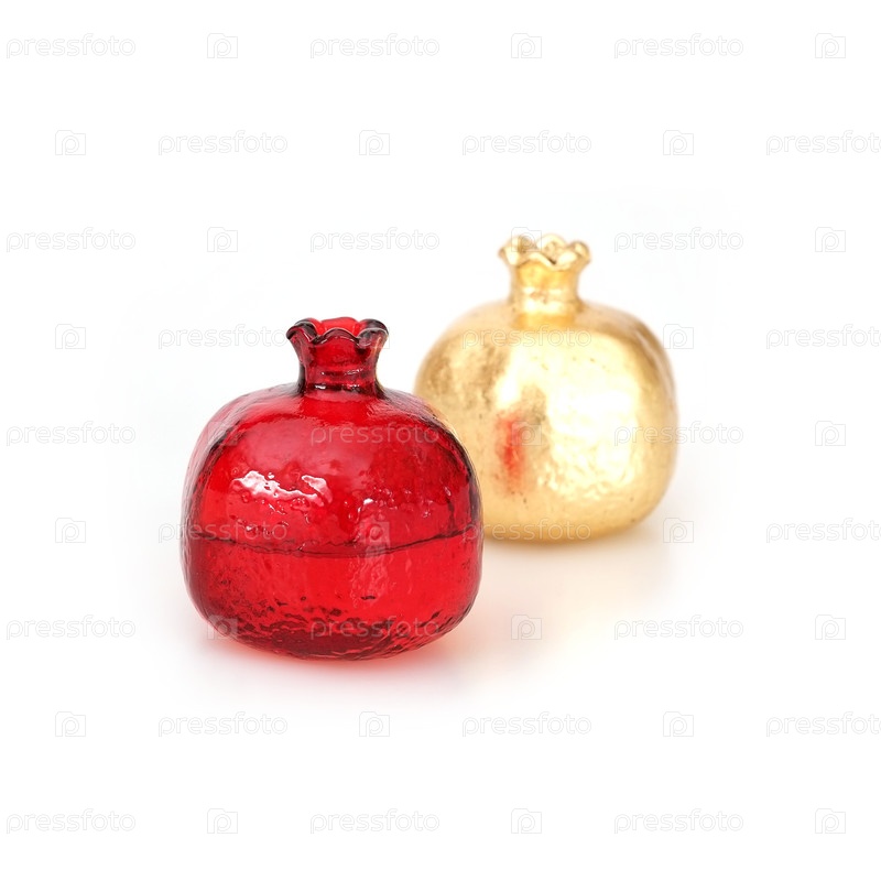 Красные и золотистые сосуды в виде фруктового граната для ароматов выделены на белом фоне