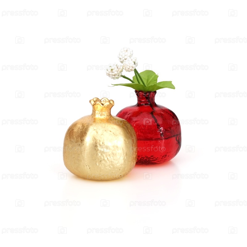 Красные и золотистые сосуды в виде фруктового граната для ароматов выделены на белом фоне