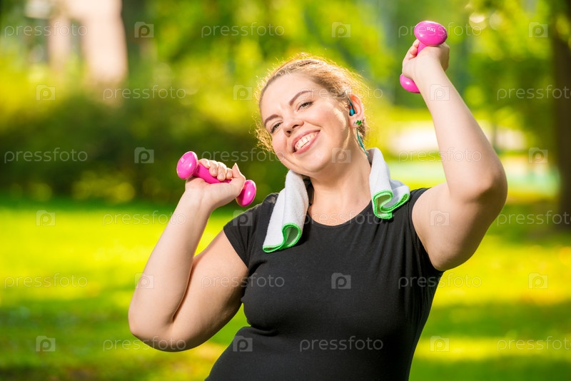 Счастливая молодая модель плюс размер с гантелями в парке во время тренировки