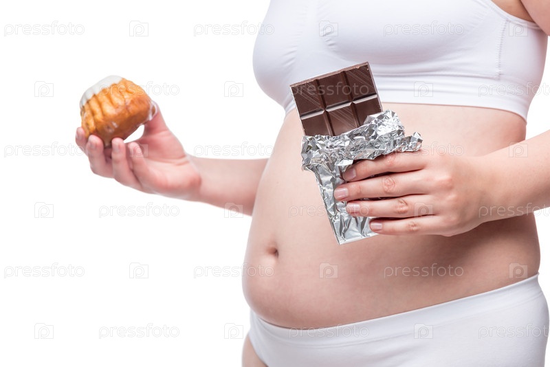 Женская жирная фигура в нижнем белье с шоколадом и кексом