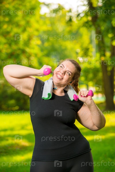 Вертикальный портрет счастливой модели плюс-size с гантелями во время тренировки в летнем парке