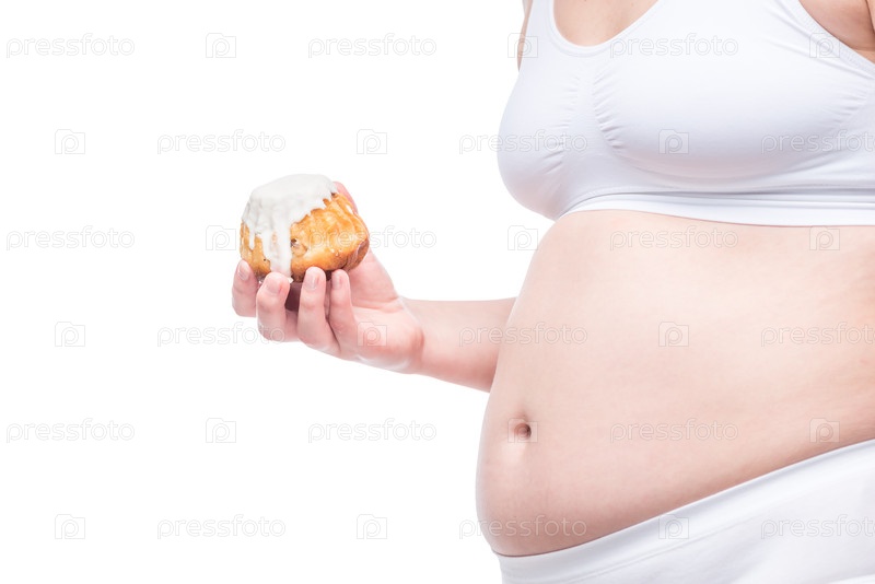 Толстая девушка с кексом в руке в нижнем белье, крупным планом живота