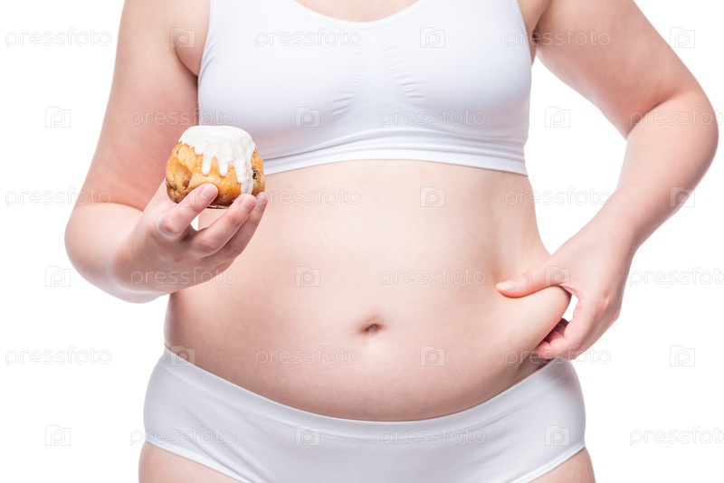 Жирная женщина с калорийным кексом в руке сжимает живот крупным планом