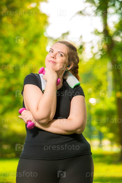 Мечта о стройной модели тела плюс размер занимается гантелями во время тренировки в летнем парке