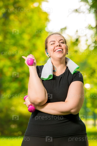 30 лет плюс размер женщины делает гантели во время летней тренировки парка