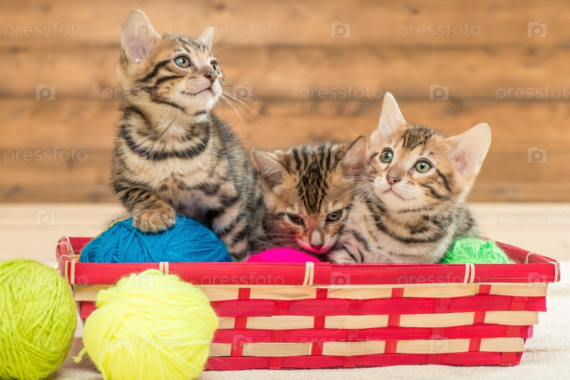 В плетеной корзине сидят три котята бенгальской породы, играющие нитями