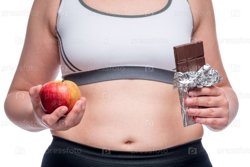Жирная женщина делает трудный выбор между яблоком и шоколадом, в кадре крупным планом живот