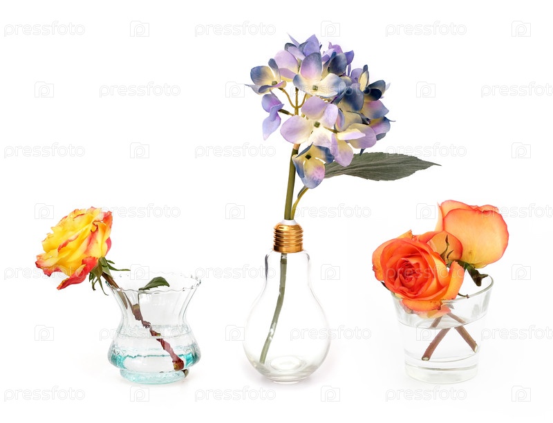 Стеклянная ваза с гортензией в виде лампочки, изолированной на белом фоне