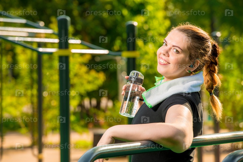 Портрет счастливой толстухи с бутылкой воды рядом с симулятором в парке